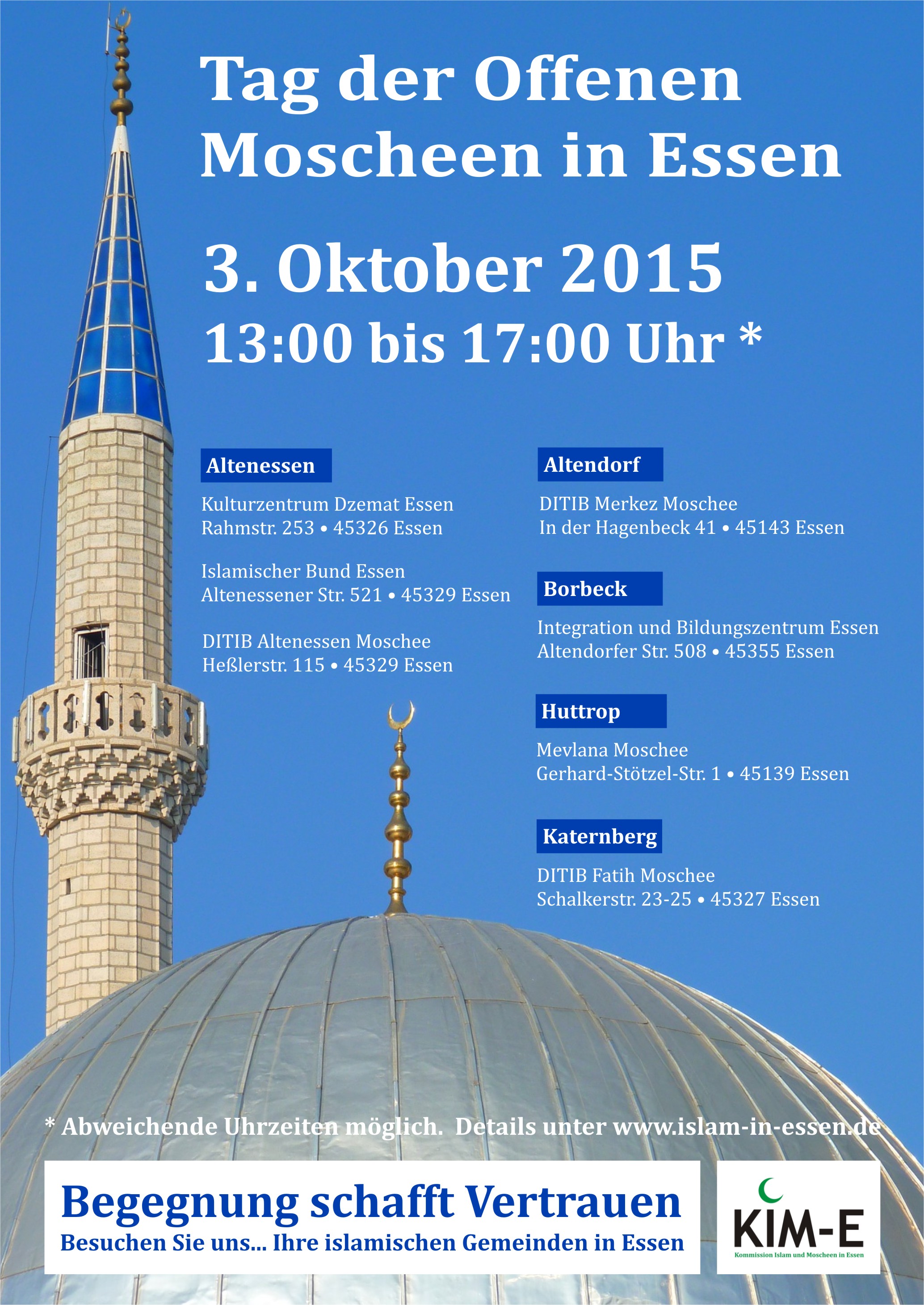 Auch die zahlreichen Essener Gemeinden – von Katernberg über Altenessen, Altendorf, Huttrop bis nach Borbeck – beteiligen sich an dieser Aktion. Von 13:00 Uhr bis 17:00 Uhr stehen die Türen der Gemeinden auf, um die Besucherinnen und Besucher über das Leben der Menschen in ihrer Gemeinde und den Islam zu informieren.